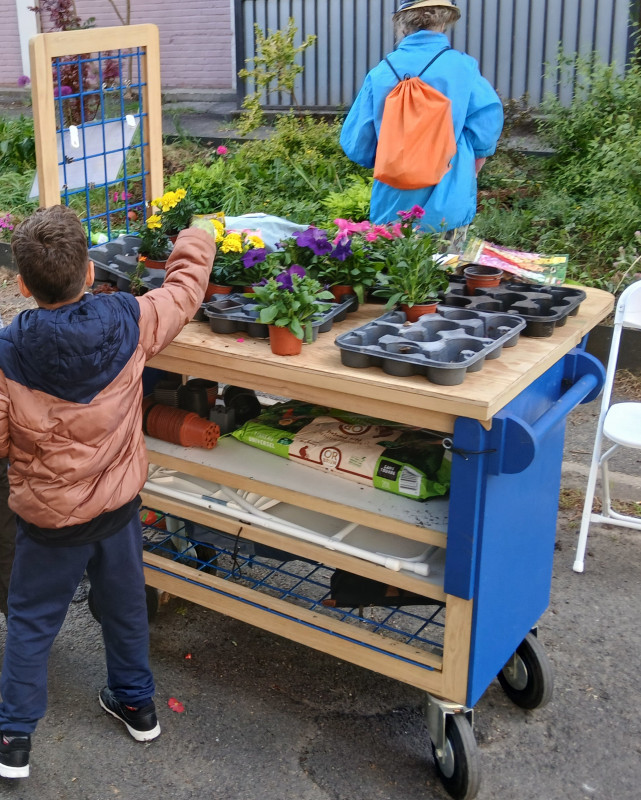 Dans le cadre d'un chantier éducatif, des jeunes du quartier accompagnés par Vraiment Vraiment ont fabriqué au début du printemps 2025 pour notre association deux outils qui répondent parfaitement aux besoins du projet : L'un de ces outils, "L'atelier mobile" (photo en bas à gauche), est un véritable stand mobile nous permettant de déambuler facilement dans les squares de la résidence avec matériel et outils de jardinage afin de jardiner avec les résidents dans différentes zones lors d'un atelier.